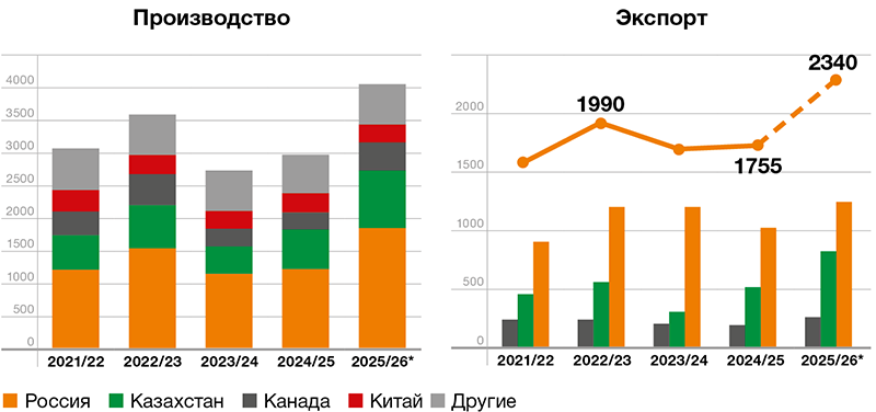 Ну и завершает рейтинг масличных культур лен. В России его произвели в 2025 году около 1,9 млн тонн. На СФО приходится 570 тысяч тонн, из которых 351 тысячу вырастил Алтайский край. По этой культуре Россия — абсолютный лидер. На втором месте Казахстан. Но он отстает от нас по производству на 1 млн тонн. Дмитрий Рылько так прокомментировал события на мировом рынке: «Ну, нарвались на сверхвысокий урожай в мире все четыре страны, которые выращивают эту культуру, — Россия, Казахстан, Канада, Китай. Подчеркну: на сверхвысокий урожай. Нужно сверхмного экспортировать. А тут еще с января европейцы максимально подняли пошлину на российский лен. И получилось, что мы освободили рыночную нишу для Казахстана».